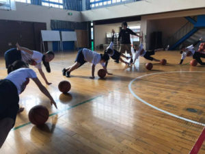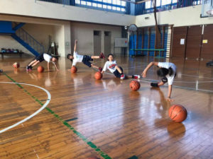| ④ハンドリング | ボールストレッチ、ボール回し、8の字、片足ボール回し背面キャッチ、肩ごしスナップ 動きながらボール回し(スキップ、サイドスキップ、ジャンプ) 股下持ち替え |